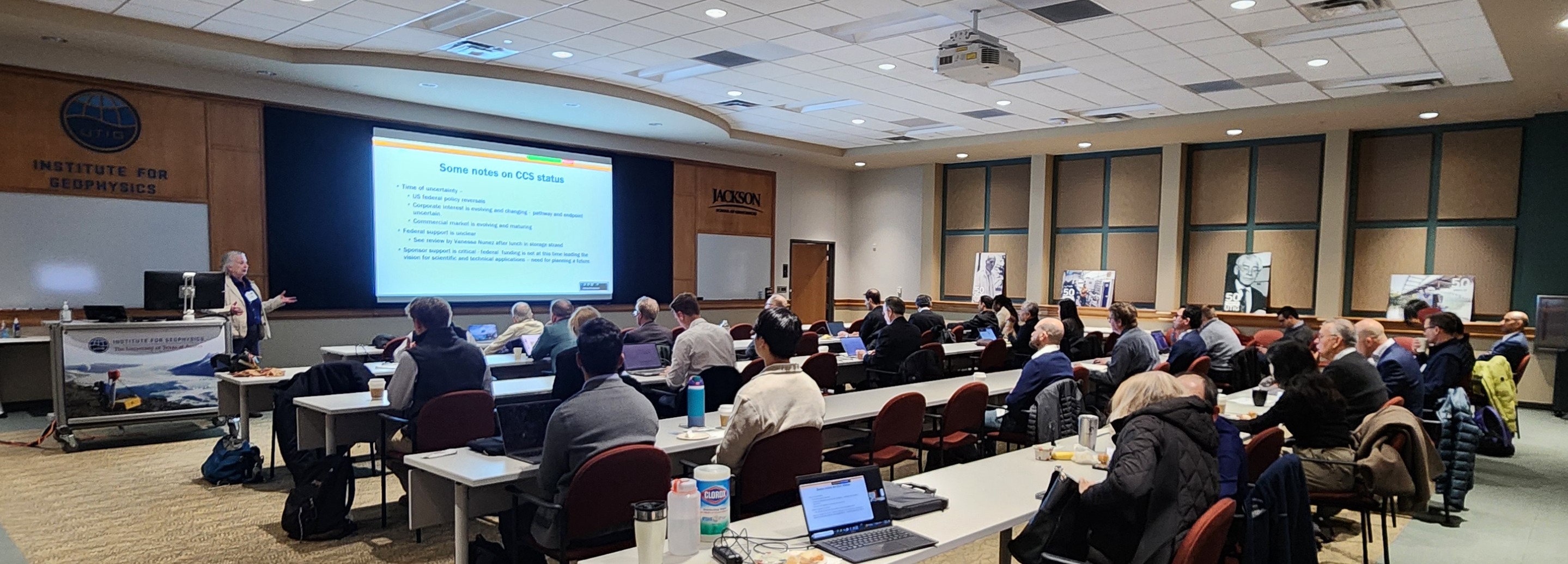 This year, the UTCCS-8 event evolved from a 2-day hybrid event into a 1-day virtual and 1-day hybrid meeting due to a winter-storm system that moved through Central Texas on Saturday, January 24, 2026. This development did not turn away many carbon capture and storage enthusiasts, since ~70 in-person attendees were present out of the 90 people who registered to attend in person for Wednesday, January 28th, 2026. Overall, we had 150 people register for the hybrid event, and sponsors of the Gulf Coast Carbon Center were able to share the virtual meeting details internally for those who had not registered.