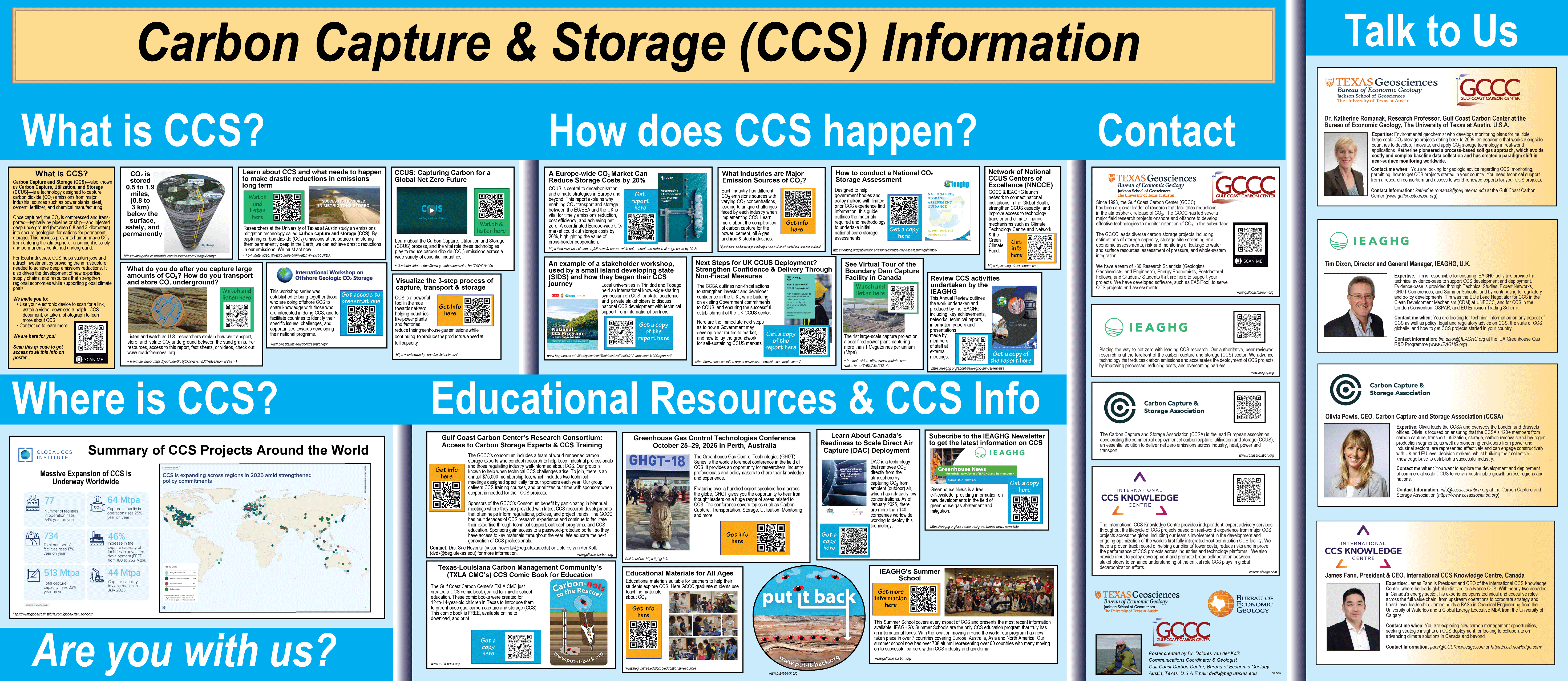 - Exhibit Booth #40, November 17–20, 2025 will be provided by institutions with extensive research experience and technical training expertise in Carbon Capture and Storage (CCS). These institutions include UT Austin's Gulf Coast Carbon Center (GCCC), IEA Greenhouse Gas Research & Development Programme (IEAGHG), Carbon Capture & Storage Association (CCSA), and the International CCS Knowledge Centre.